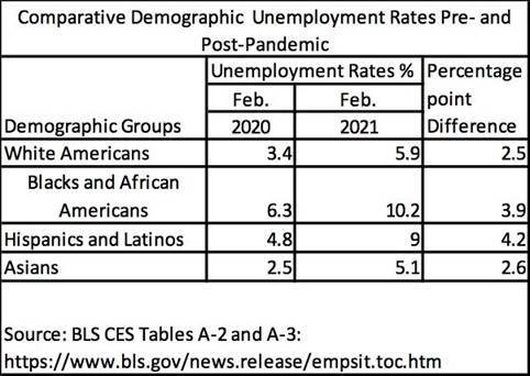 The pent up demand expectation seems to be based on the belief that once COVID has gone away (through vaccinations/herd immunity) this will unleash a wave of ‘pent-up’ consumer (and business) spending causing a strong rebound in economic growth that will lead to dramatic reductions in unemployment and result in more Americans having higher levels of disposable income that in turn will create higher consumption, and eventually a tighter labour market with higher wages and higher levels of economic activity that ultimately result in inflation because of these higher wages and this higher demand for goods & services (although this cycle didn’t happen pre-covid despite record employment numbers).Superficially that sounds plausible but we have several issues with this, partly because it’s an oversimplified explanation of how inflation works but also the latest official US unemployment data indicates that the ethnic groups that have been hit hardest are those with the lowest average income levels (Black/African Americans, followed by Hispanic/Latinos). The lowest wage earners would in our view logically account for the majority of the dip in consumer spending in the US seen since the outbreak in Covid-19 (not the wealthy who continued to spend pretty much as usual as far as we can tell). The lower income groups tend to spend all of their surplus income, and as this group also has made up most of the increase in unemployment numbers we suspect that a broad based consumer recovery at this time is unlikely. The lowest income levels have seen a depletion of savings/increase in debt levels.Many of the ‘missing jobs’ are in retail, transportation, construction and leisure/hospitality – Luxury goods sales have held up well.We suspect that those in the highest wealth and income categories (where savings have generally increased significantly) might have less pent-up demand – going back to the point of interest that sales of the highest profile luxury brands have generally held up well.Too many people with limited spending power – no surge in luxury, a volume surge, a retail margin squeeze in middle ground and too many consumers with limited spending power and this doesn’t seem likely to lead to a hiring rush. We’d apply a similar expectation to leisure and to travel and also to new home sales.Change of habits - we note that consumers have changed their habits during the lockdown – whether buying goods online, exercising from home, working from home or ordering at home dining. We find it hard to square this change in consumption habits with expectations of the great re-opening leading to a huge re-hiring. Can we really expect there to be something like the 2.5 million jobs created to take these 4 sectors back to where they were pre-COVID? That seems a huge contradiction to us. As well as the 2.5 million in these 4 sectors who became officially unemployed in the last 12 months, many of the other 1.5 million official non-farm employees who lost their jobs during this time and have been unable to find employment are also dependent on these four sectors. If we don’t go back to the same lifestyle habits as before, then these four million of these jobs are unlikely to return.What’s more, as of last month, there were a further 6.9 million Americans classified as ‘not in the labor force’ but seeking employment. This may include some of the 3-4 million new workers who would have joined the workforce in 2020-21 but haven’t been able to, but there is an employment crisis with up to 20 million Americans out of work. If the majority of these can find gainful employment and add to consumption, this would have a huge impact. But there are currently no signs that this is happening.It doesn’t just seem to be an issue of confidence – if we look at the pre-COVID official unemployment, we can see that the worst performing employment sectors were leisure/hospitality, construction, professional services, non-durable goods and retail. The weakness in the US economy didn’t begin with COVID and therefore it seems to be a leap of faith to suggest that herd immunity and mass vaccinisation will cure that weakness.
