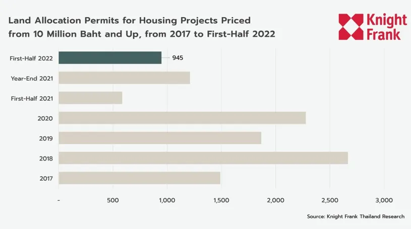 From 2017 to the first half of 2022, it was found that the number of land allocation permits granted for homes in the price range of 10 million baht or more (whole project) included 11,032 units. In the first half of 2022, the land allocation permits in this segment included 945 units.