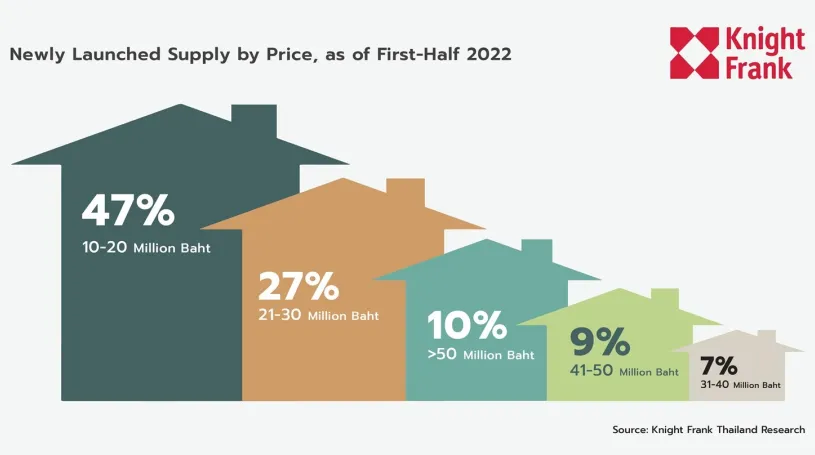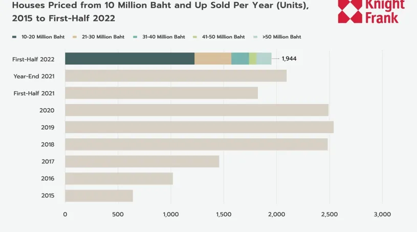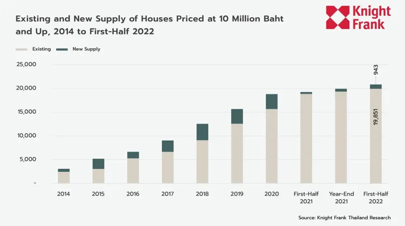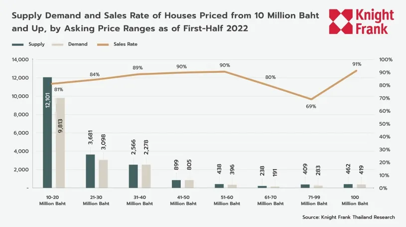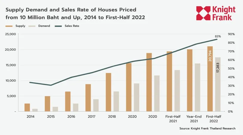 As of the first half of 2022, it was found that houses priced at 10 million baht or more cumulatively included a total of 17,283 units sold out of a total supply of 20,794 units, representing a sales rate of 83 percent. The sales rate increased 6 percent from the end of 2021 and increased 14 percent compared to the same period last year where the sales rate was 69 percent.