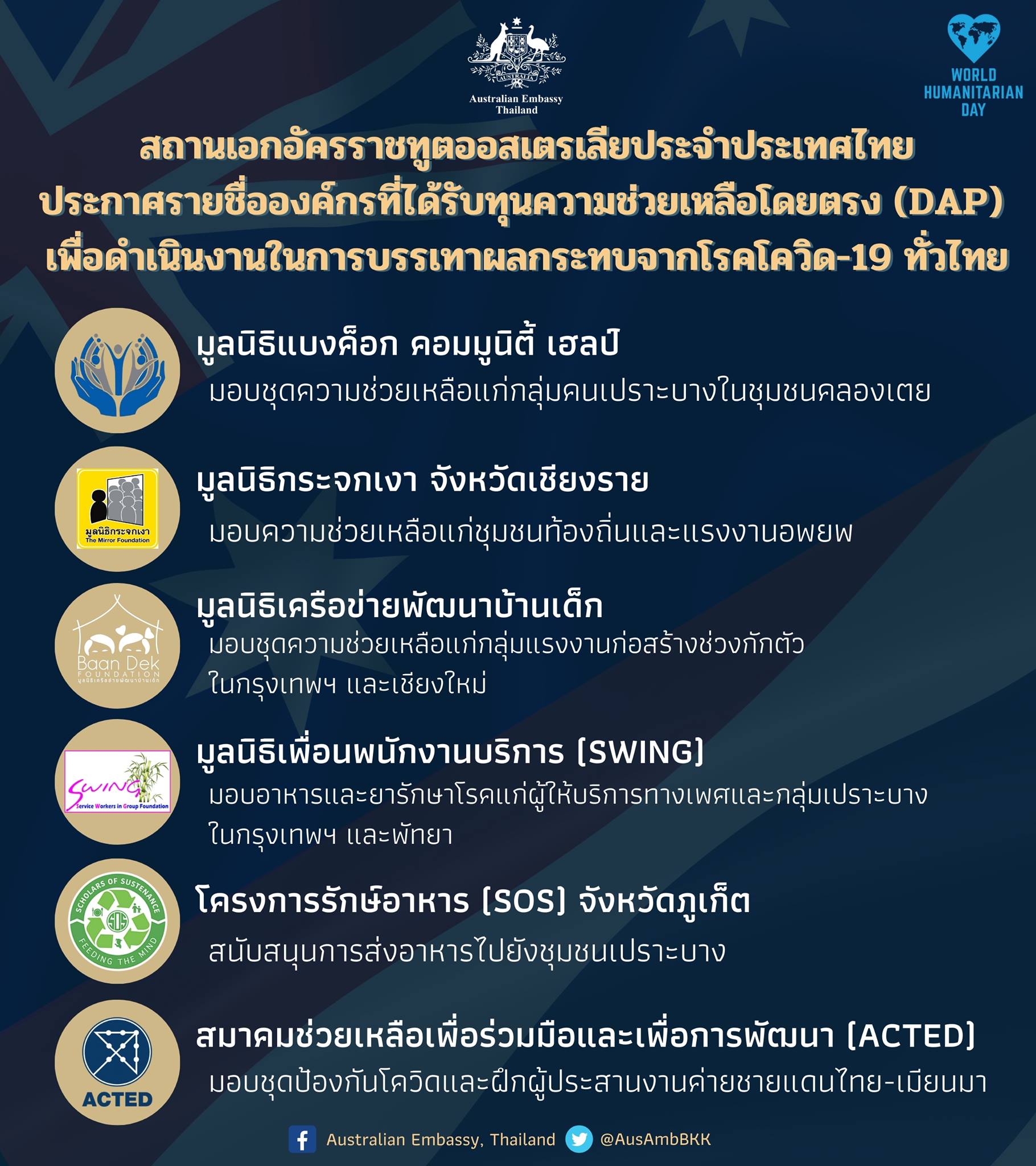 The Australian Embassy in Thailand is pleased to announce grants for COVID-19 relief activities under the Direct Aid Program to:
