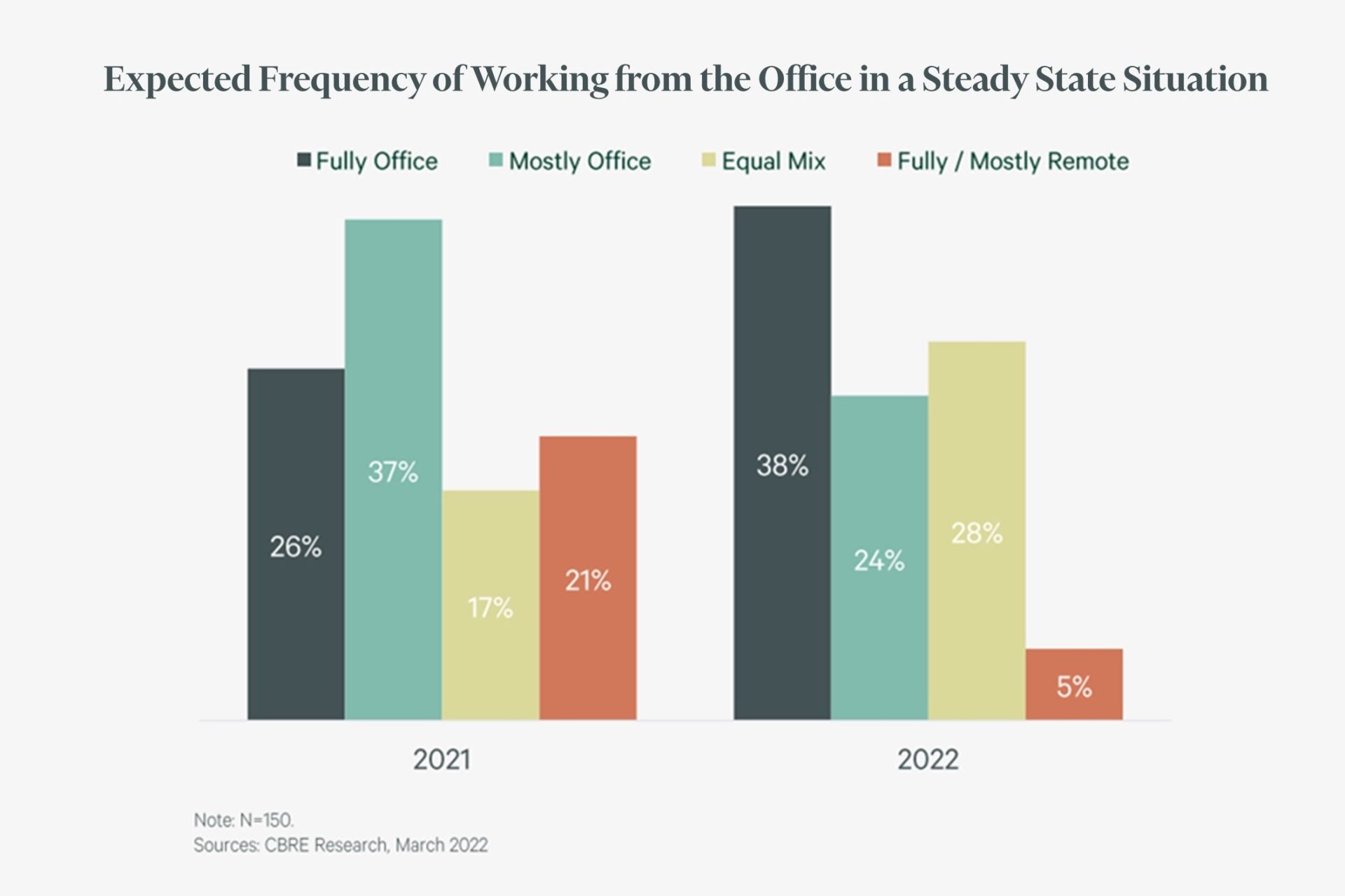 The overriding preference for office-based working in Asia Pacific signals healthy long-term prospects for office demand, with nearly half of respondents intending to increase their real estate portfolios over the next three years, while 59% of multinationals plan to expand this year, up from 33% in 2021.