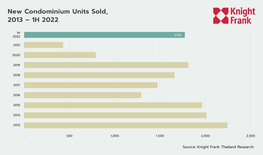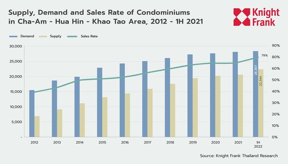 In the first half of 2022, there have been 22,344 condominiums in Cha-Am - Hua Hin - Khao Tao sold out of a total supply of 28,307 units, representing a sales rate of 79 percent. The sales rate has improved compared to 2021. In the first half of 2022, there were 1,773 units sold. From our market survey, it was found that, as of the first half of 2022, around 5,963 units remain for sale.