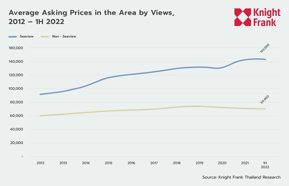 The average asking price of sea view condominiums in the area is roughly 143,000 baht per square metre. Prices have increased by 1 percent from 2021, with new sea view units having an average selling price of 250,000 baht per square metre. The average asking price of condominiums that do not have sea views is around 69,800 baht per square metre. The asking price is relatively stable and has dropped slightly at a rate of 1.3 percent from 2021, due to projects with more than 50 percent unsold units located in the Cha-Am area. Developers continue to organize promotions and discounts to close the sales of these projects. Also, newly launched in-land projects are selling at about 52,000 baht per square metre. As a result, the average price in the in-land zone slightly decreased.