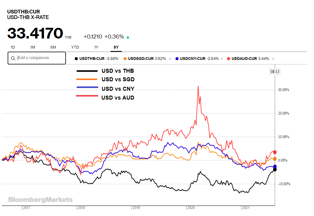 The THB versus the USD has been remarkably resilient in recent years largely due to the country’s relatively low public debt to GDP and limited corporate investments made either in Thailand or abroad, while family savings have also been inclined to stay at home.