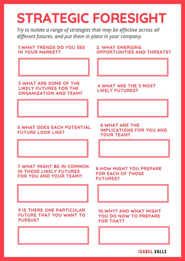 A great way to start developing this skill is to engage in dialogue with people that have vision and are open to possibilities, whether in your company, your industry, or any other fields. Explore and discover what potential futures could look like, and what those may mean for you. After that, follow the process below to help you extract the right strategies for your company and your team: