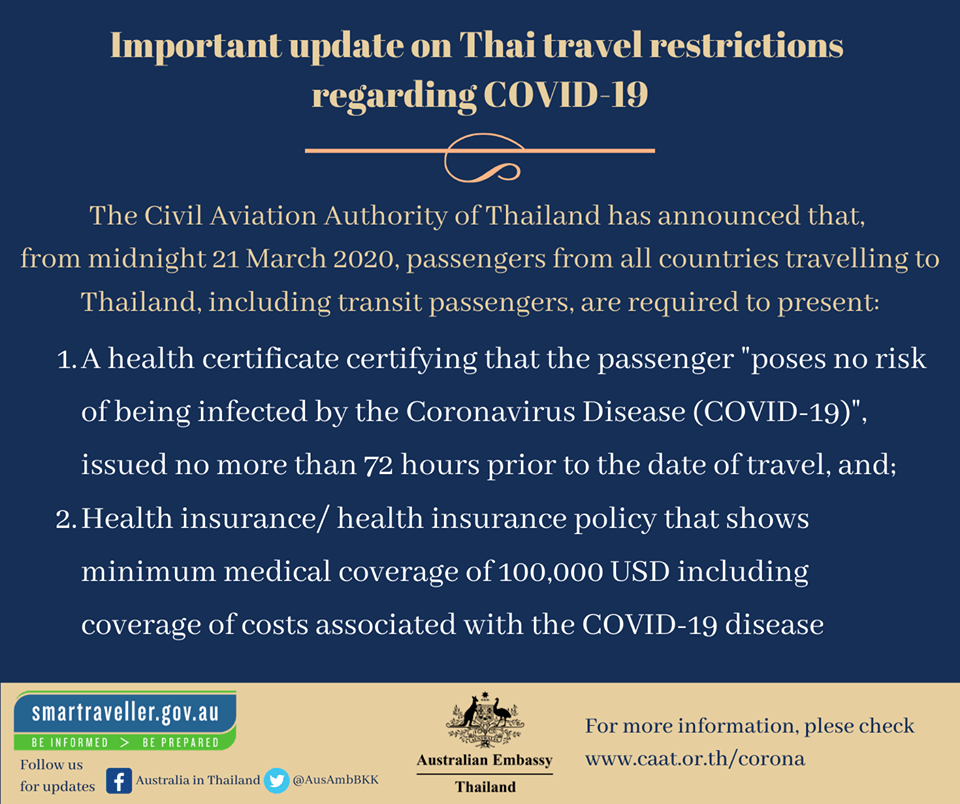The Civil Aviation Authority of Thailand has announced that, from midnight 21 March 2020, passengers from all countries travelling to Thailand, including transit passengers, are required to present:
