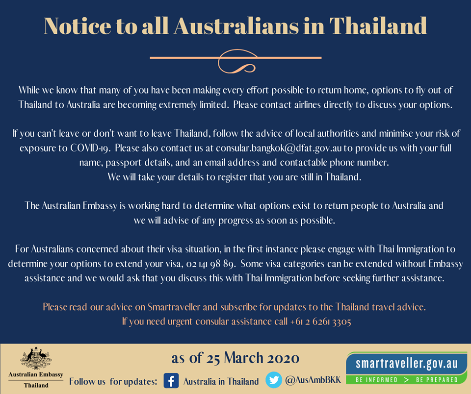 While we know that many of you have been making every effort possible to return home, options to fly out of Thailand to Australia are becoming extremely limited. Please contact airlines directly to discuss your options.