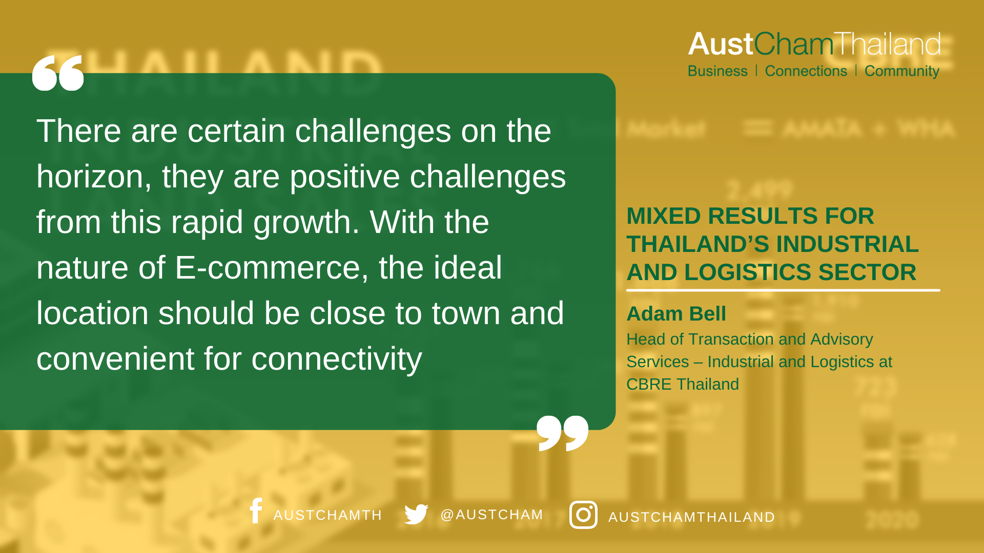Mr. Bell added “There are certain challenges on the horizon, they are positive challenges from this rapid growth. With the nature of E-commerce, the ideal location should be close to town and convenient for connectivity. The hot spot for e-commerce warehousing is on Bangna-Trad Road between km.18 - km.23, where connectivity to Bangkok, Suvarnabhumi and Laem Chabang deep seaport come together in an area zoned for large warehouse properties favoured by e-commerce companies. In this location, CBRE is now seeing significant shortage of large developable land plots, and of those plots available, the land prices are making justification of warehouse development challenging.”