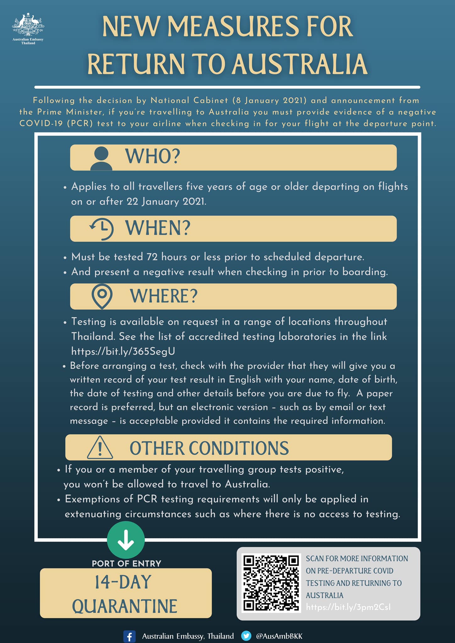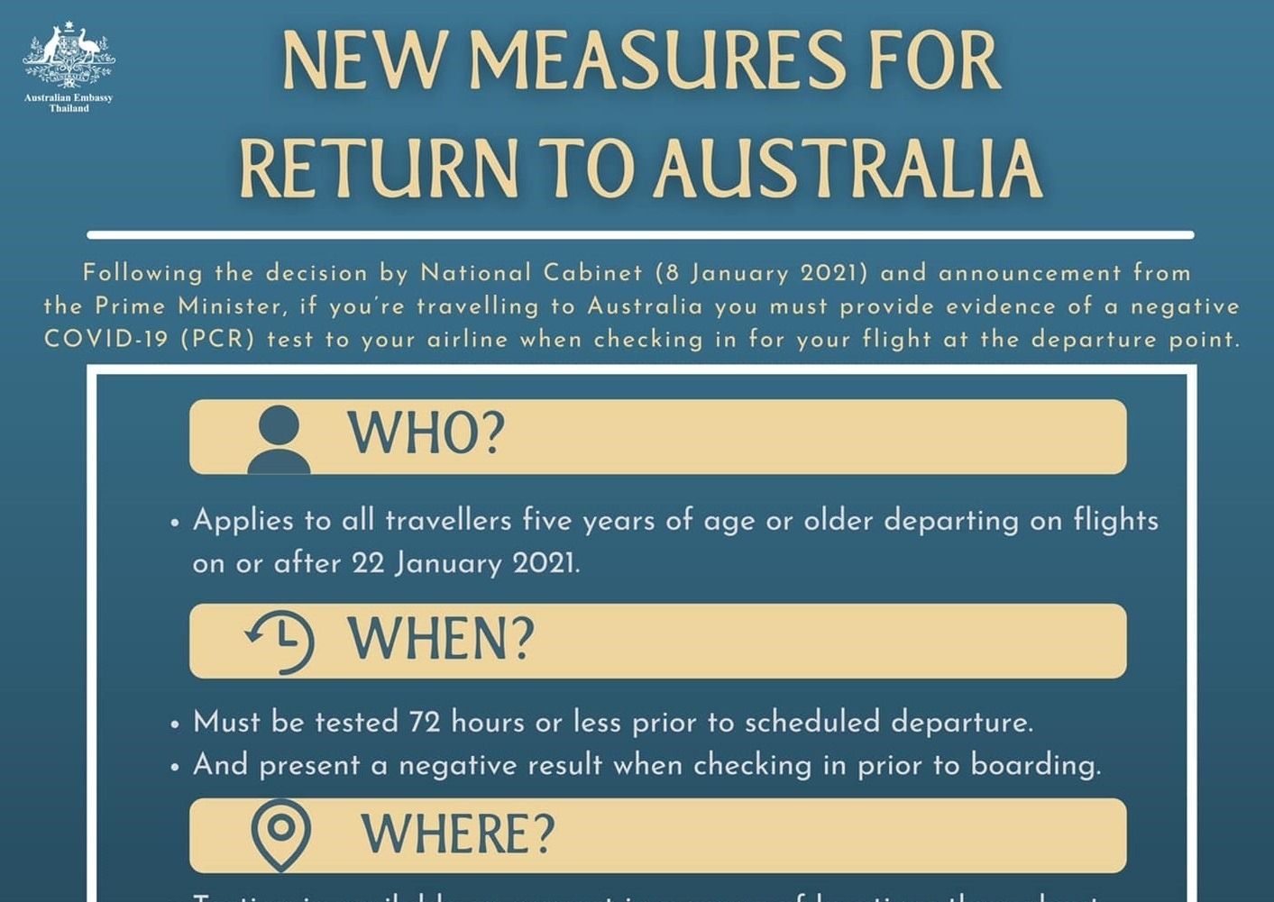 Following the decision by National Cabinet (8 January 2021) and announcement from the Prime Minister (https://www.pm.gov.au/media/statement-national-cabinet), if you’re travelling to Australia you must provide evidence of a negative COVID-19 (PCR) test to your airline when checking in for your flight at the departure point.
