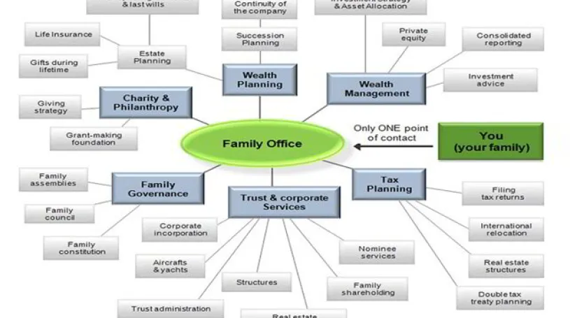 No. MBMG takes confidentiality very seriously and we will always inform the client first if an MBMG or affiliate or partner is required to assist our advisory practice, or if we engage working partners in Singapore, Hong Kong, the Isle of Man, Jersey or the UK to help with entity setup up or restricting or simply corporate or individual bank account openings and we operate strict ‘Chinese Walls’ in relation to information. Relationships are always structured to identify, mitigate and avoid conflicts of interests. Below is a graphical display of all the elements of a Family Office for a more concise explanation.