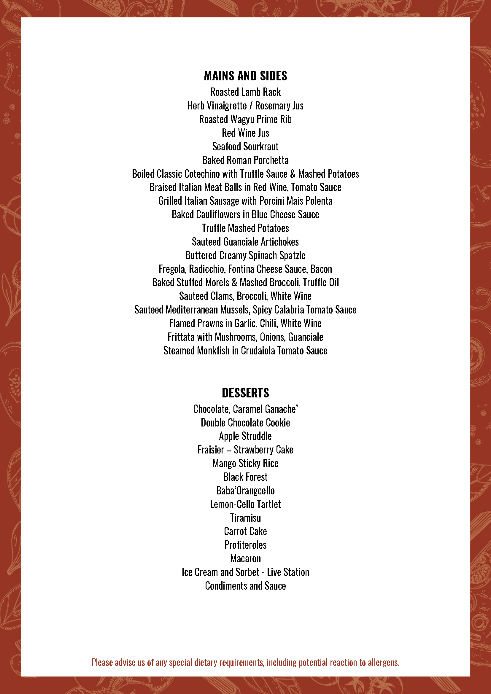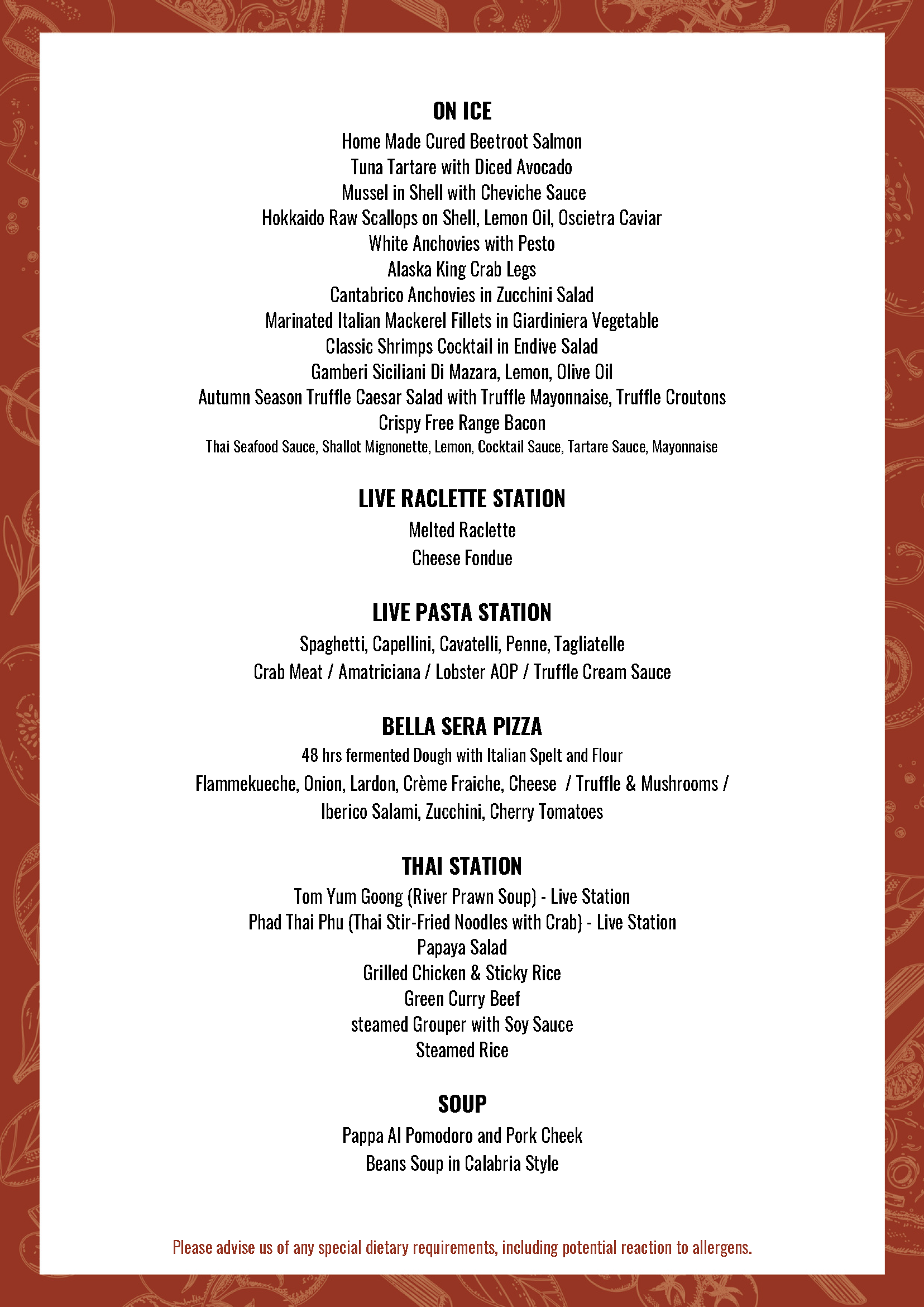 Embark on a culinary journey through the Alps with Raclette, premium seafood-on-ice, carving stations, and signature European dishes, complemented by live entertainment.