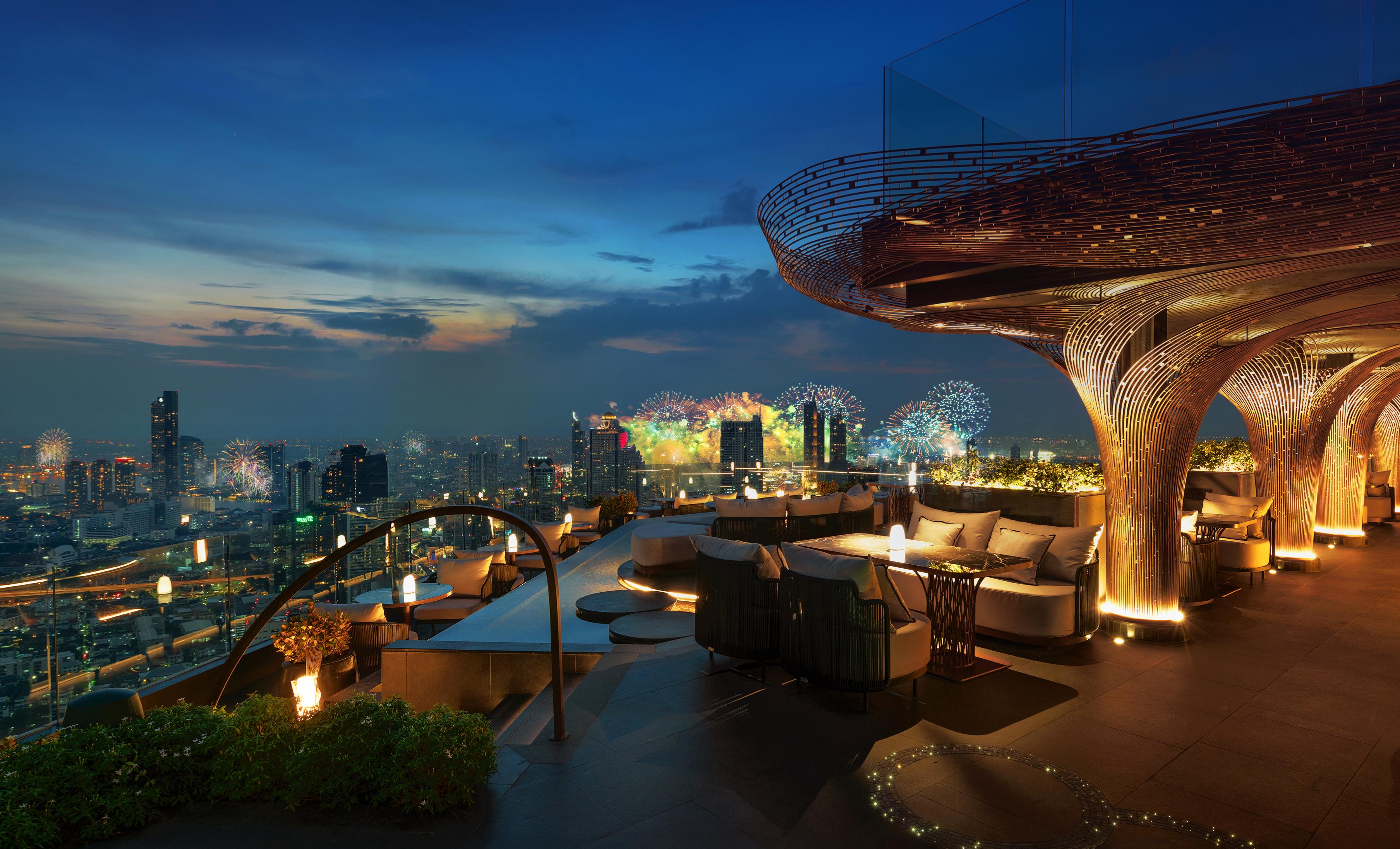 The Sky Bar Premium package comprises the ten-course menu, ultra-premium beverage package, and the finest seats for the midnight fireworks spectacular. Regular priced at THB 59,000 net per person, or THB 50,000 net per person for early bird reservations.
