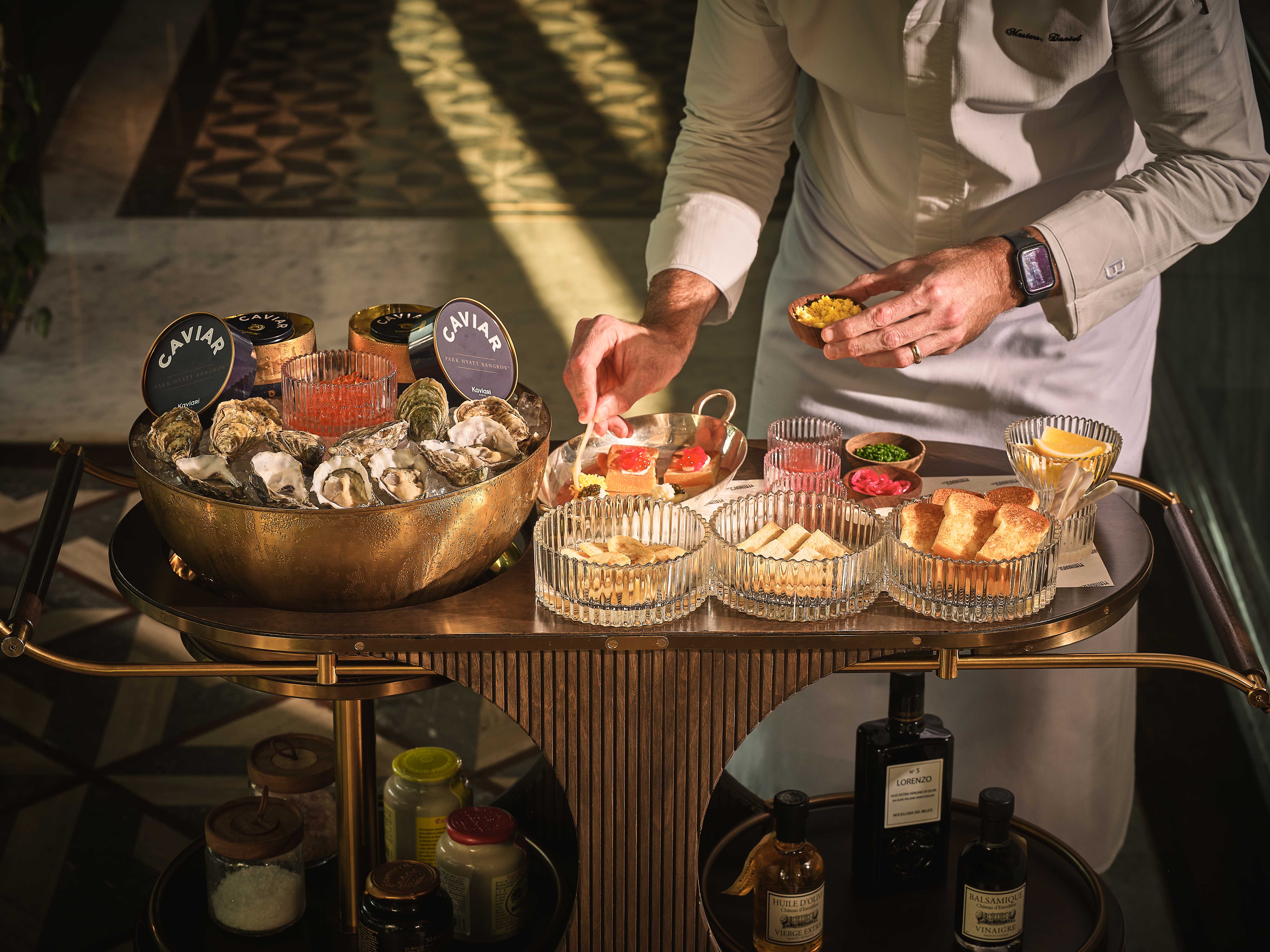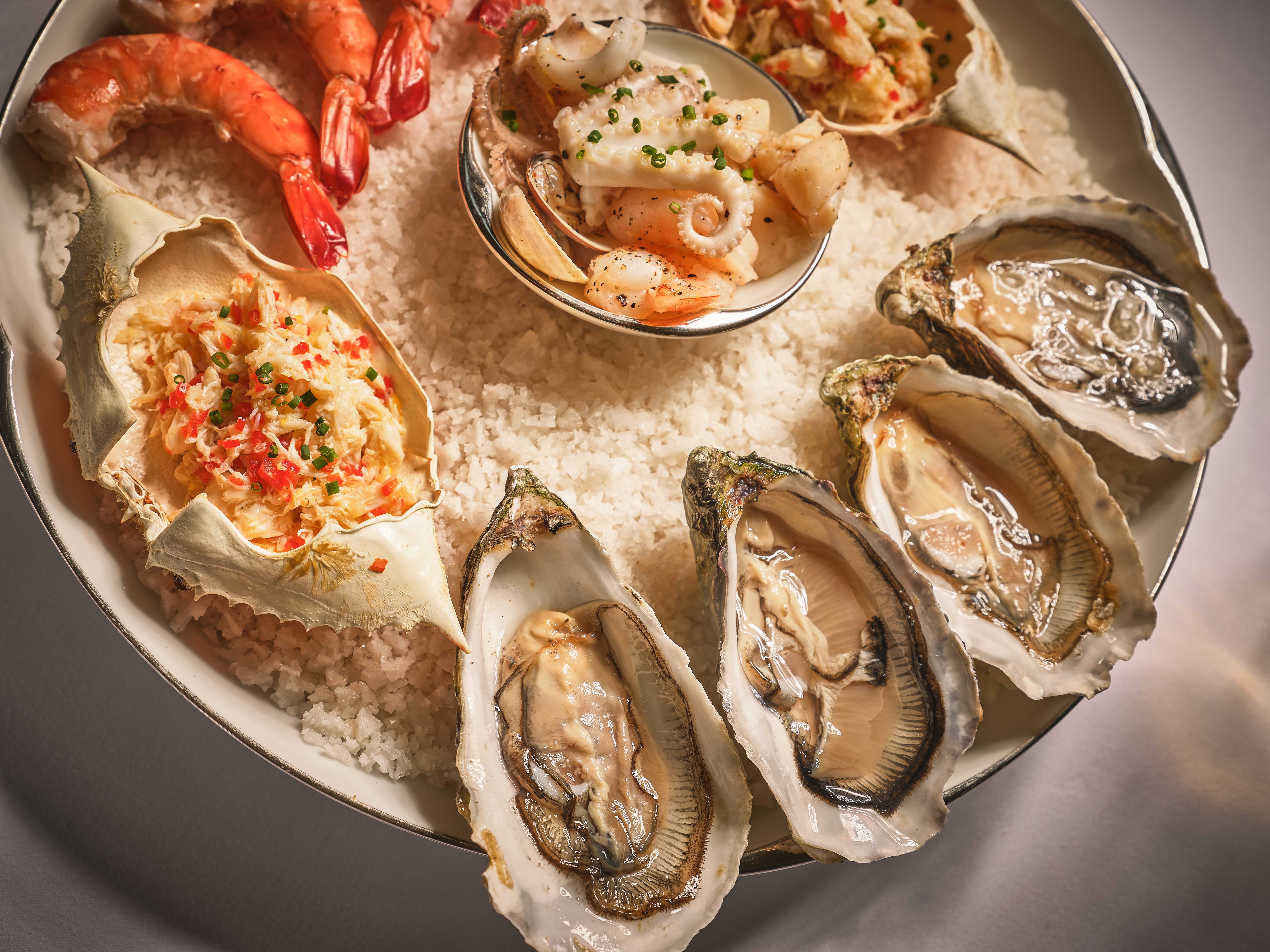 The experience begins with Seafood on Ice, followed by a tableside caviar trolley featuring Kaviari Kristal and Osetra caviar, salmon ikura, and freshly shucked Sentinelle oysters. Highlights include foie gras with cherry compote, dried figs, brioche, and pear, alongside Jamón Ibérico and the restaurant’s signature Meat Platter, showcasing premium cuts grilled over the Parrilla and finished in the Kopa oven.