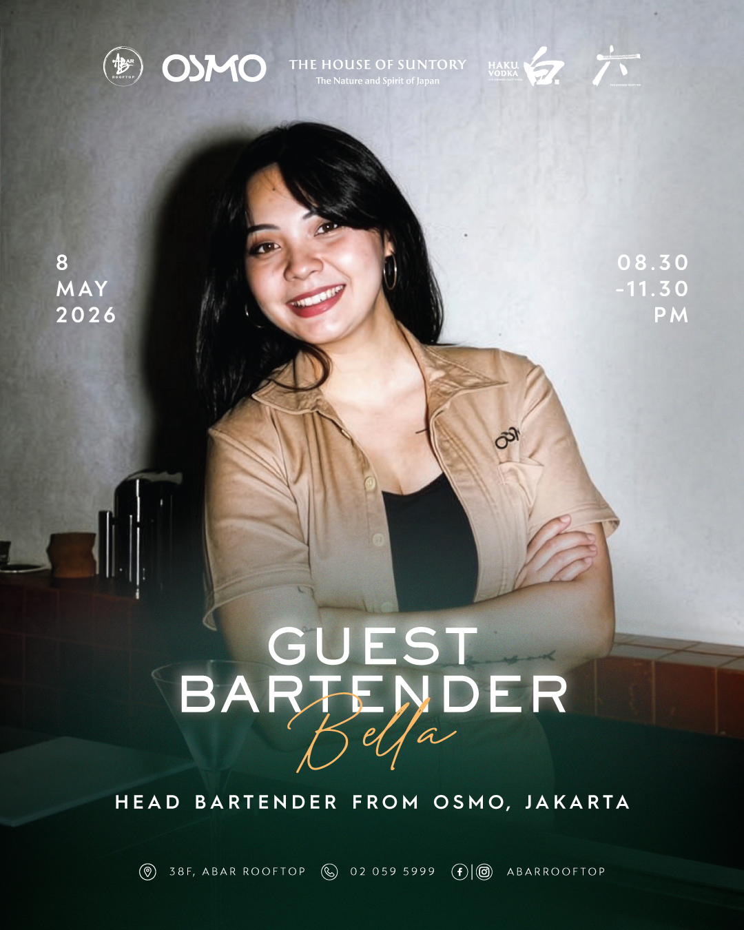 On May 8, 2026 (20.30 – 23.30 hrs), Bella, Head Bartender from OSMO, the stylish speakeasy in Jakarta, will thrill guests at ABar Rooftop with her creative approach to mixology. Famed for her refined techniques and innovative flavor pairings, Bella will present a curated selection of cocktails that reflect OSMO’s bold philosophy of bastardizing classics reimagining familiar cocktails with irreverent twists