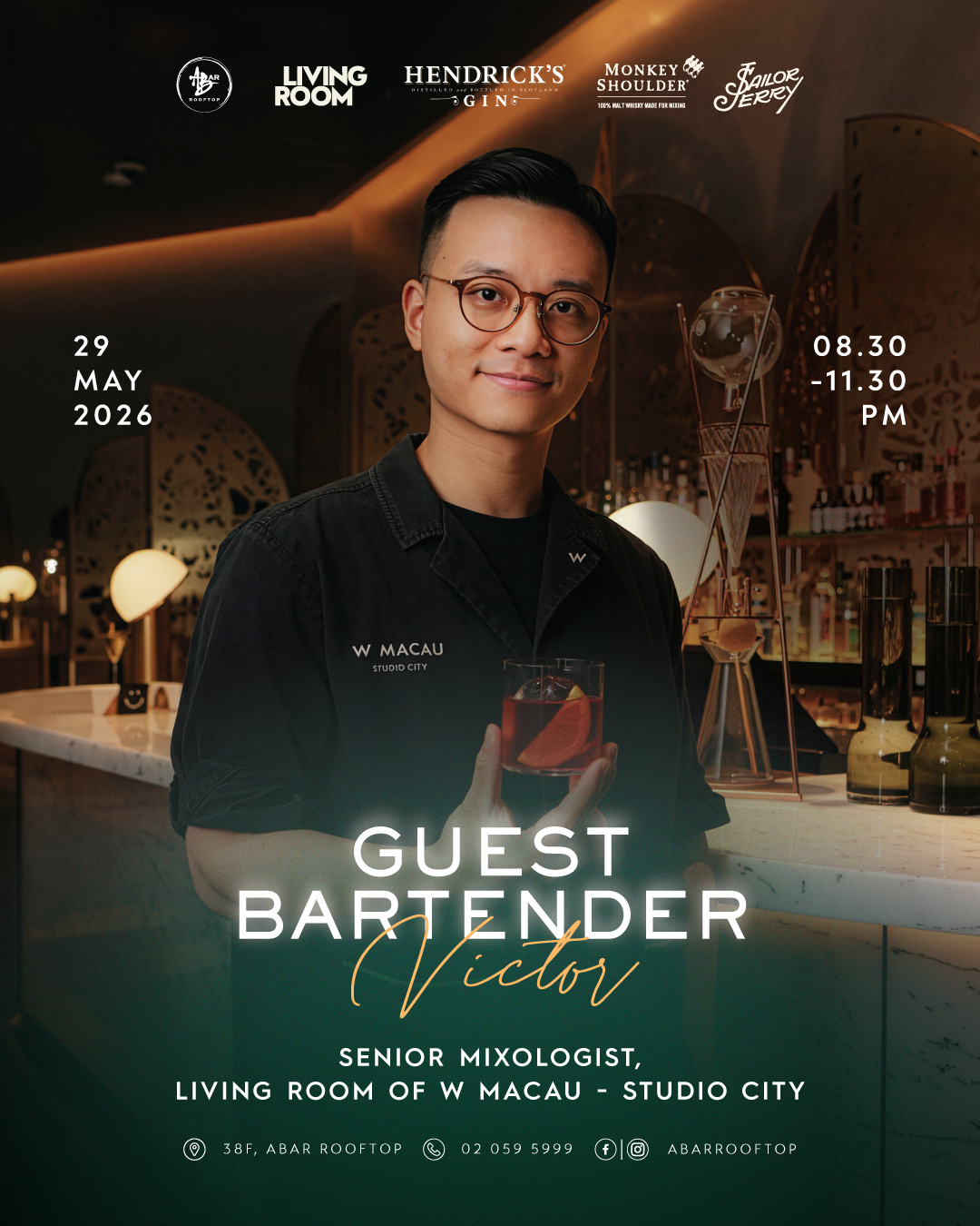 Then on May 29, 2026 (20.30 – 23.30 hrs), visitors to ABar Rooftop can experience the artistry of Victor, Senior Mixologist from W Living Room Bar, W Macau – Studio City, the luxury lifestyle landmark on the vibrant Cotai Strip. With a flair for theatrical presentation and bold, contemporary flavors, Victor’s drinks embody Macau’s dynamic East‑meets‑West spirit and ensure a highly immersive social experience.