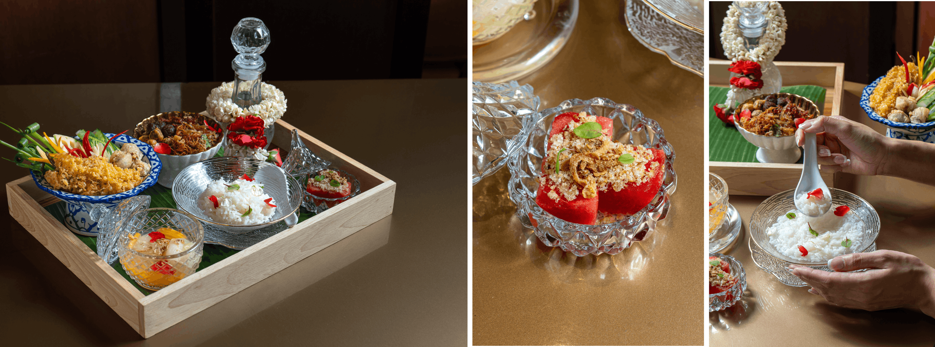 Each set is complemented by a refined selection of savoury and sweet accompaniments, carefully crafted to highlight balanced flavours and showcase traditional preparation methods. Beautifully carved vegetables and seasonal Thai desserts complete the experience, offering guests a light and refreshing midday treat during the warm summer season.