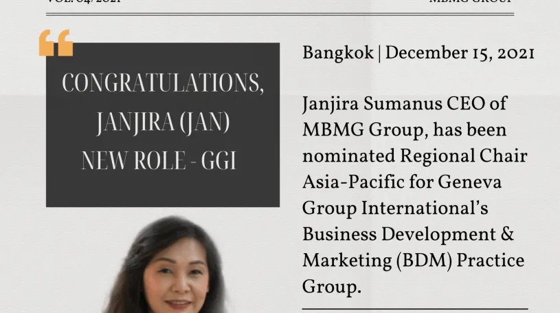 Bangkok | December 8, 2021 Janjira Sumanus CEO of MBMG Group, has been nominated Regional Chair Asia-Pacific for Geneva Group International’s Business Development & Marketing (BDM) Practice Group.