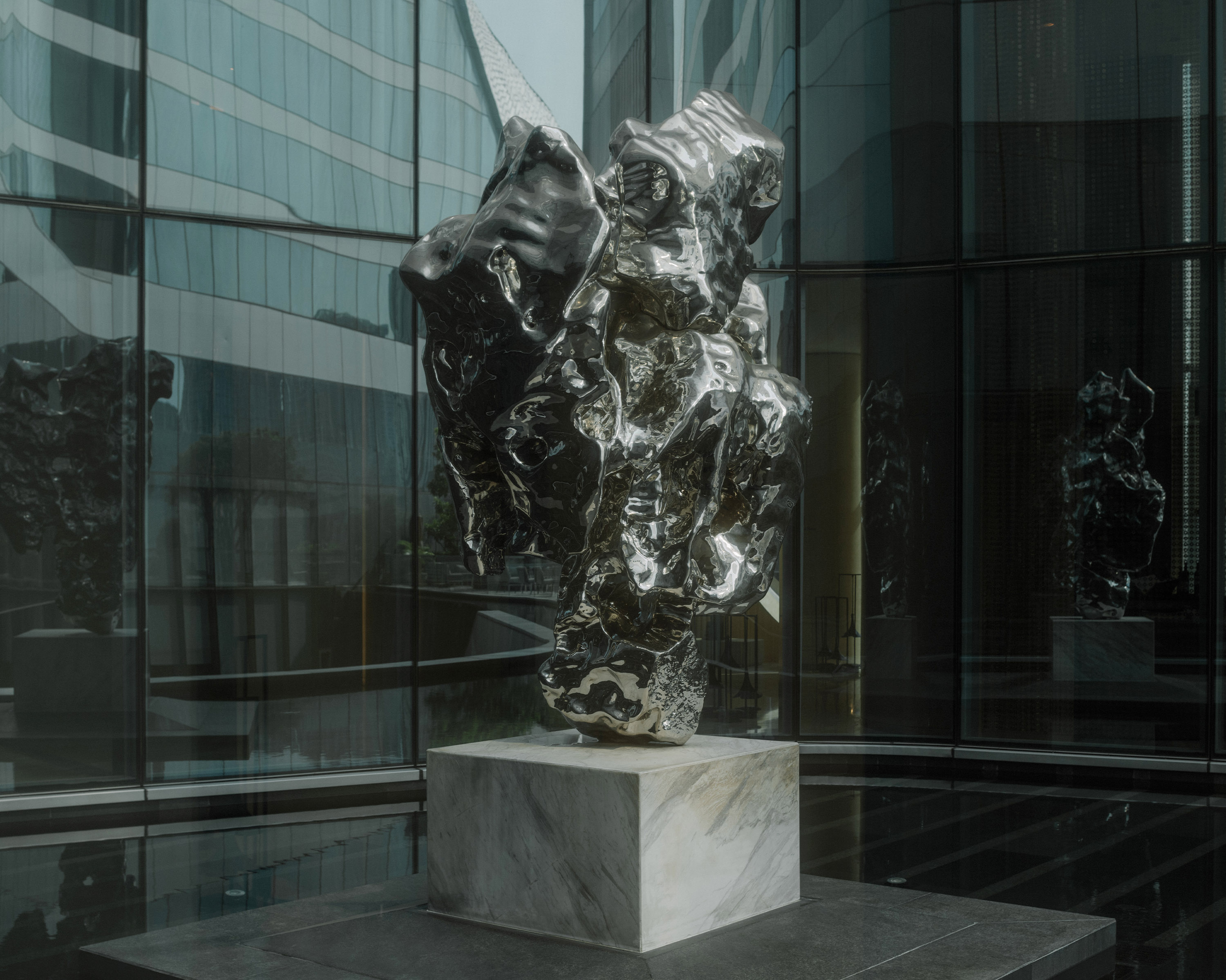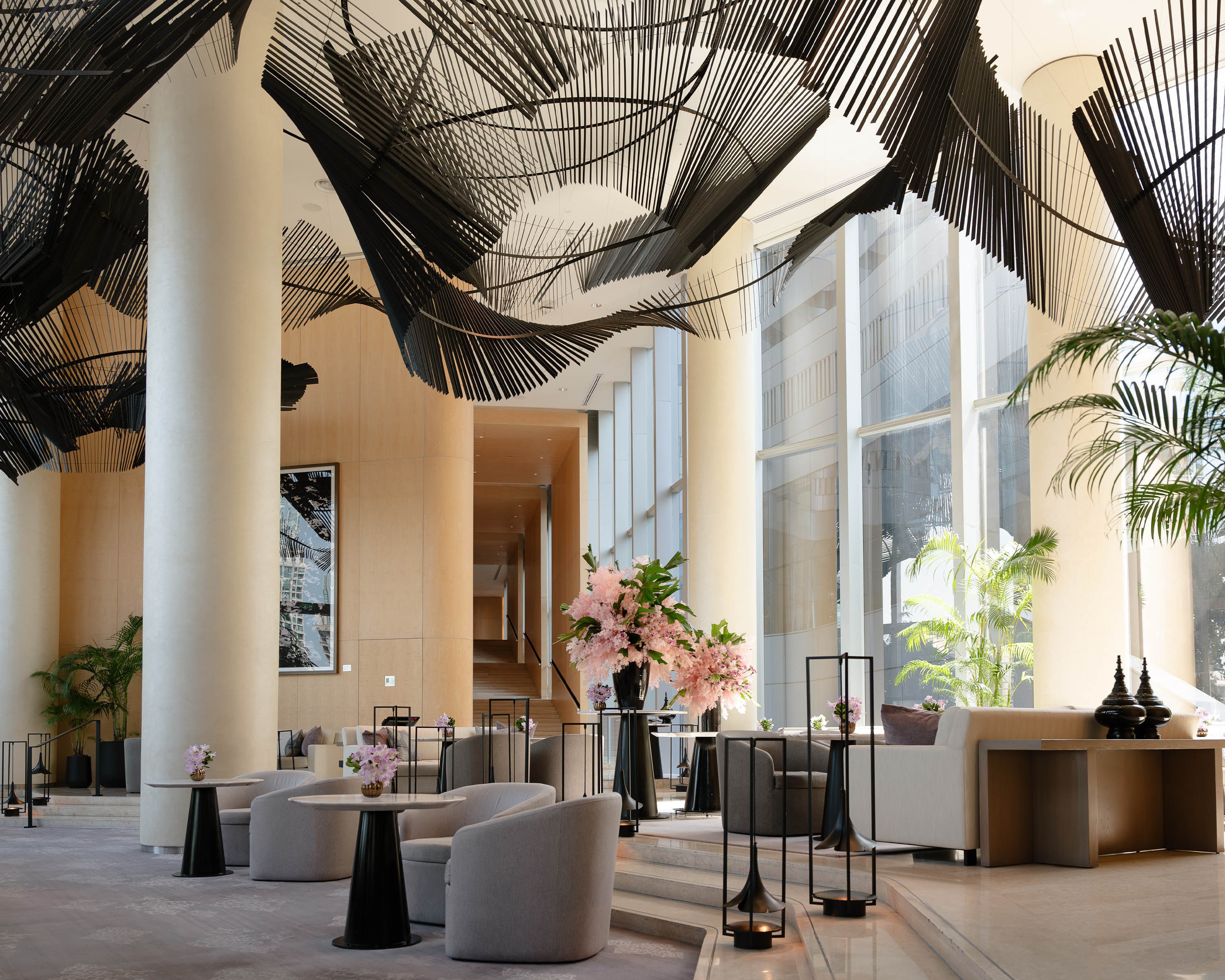 The narrative continues through Chatchai Puipia’s uplifting floral works, vibrant tuk‑tuk imagery and bespoke pieces created exclusively for The Bar and Embassy Room La Marina. Additional notable works include Cambodian‑born Sopheap Pich’s rattan‑based Grid Work, Zhan Wang’s iconic stainless‑steel Scholar’s Rock, Sriwan Janehuttakarnkit’s emotionally symbolic Party, Nonthivathn Chandhanaphalin’s contemporary Buddha sculpture Attainment Concentration displayed in the reception area, Kamin Lertchaiprasert’s spiritually inspired installation Go With the Wind, Not the Bamboo, and Andreas Gursky’s compelling aerial photograph Chao Praya (Bangkok VII), prominently showcased in the Living Room.