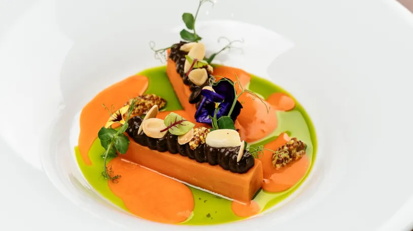 complemented with celeriac, pickled shallots, grilled cabbage and raspberry jus. Chef Giacomo is also passionate about plant-based cuisine. This is demonstrated in his vegan main course of Carota – a celebration of the freshest, sweetest carrots in a variety of styles and textures.