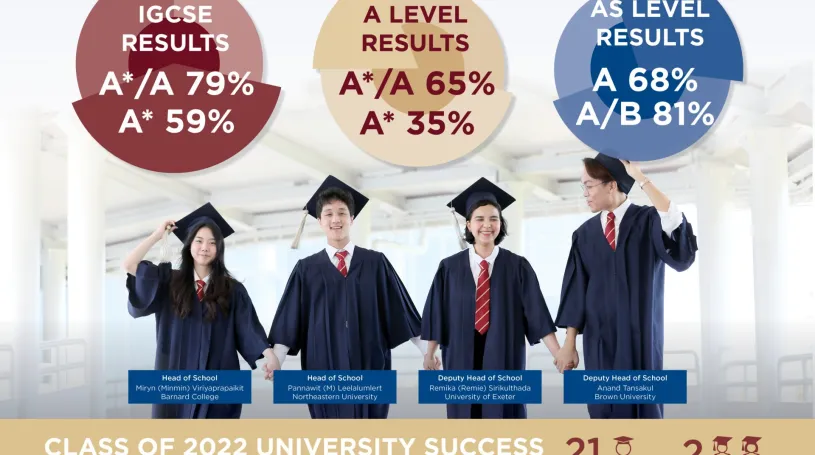 In terms of US colleges, the class of 2022 also had successes with Ivy League destinations. Pongsapak “Por” Waiwitlikhit, who has been accepted in Princeton University’s Liberal Arts and Science course, achieved 4A* grades for Maths, Further Maths, Psychology and Economics. Pattriya “Sarah” Chinvattanachot, who also achieved 4A* grades for Maths, Further Maths, Geography and Economics, will take up Liberal Arts and Sciences at the University of Pennsylvania. Meanwhile, Anand Tansakul, with 2A* in Business and Art and A in Economics, is headed to Brown University to study Liberal Arts and Sciences for his undergraduate course as well.