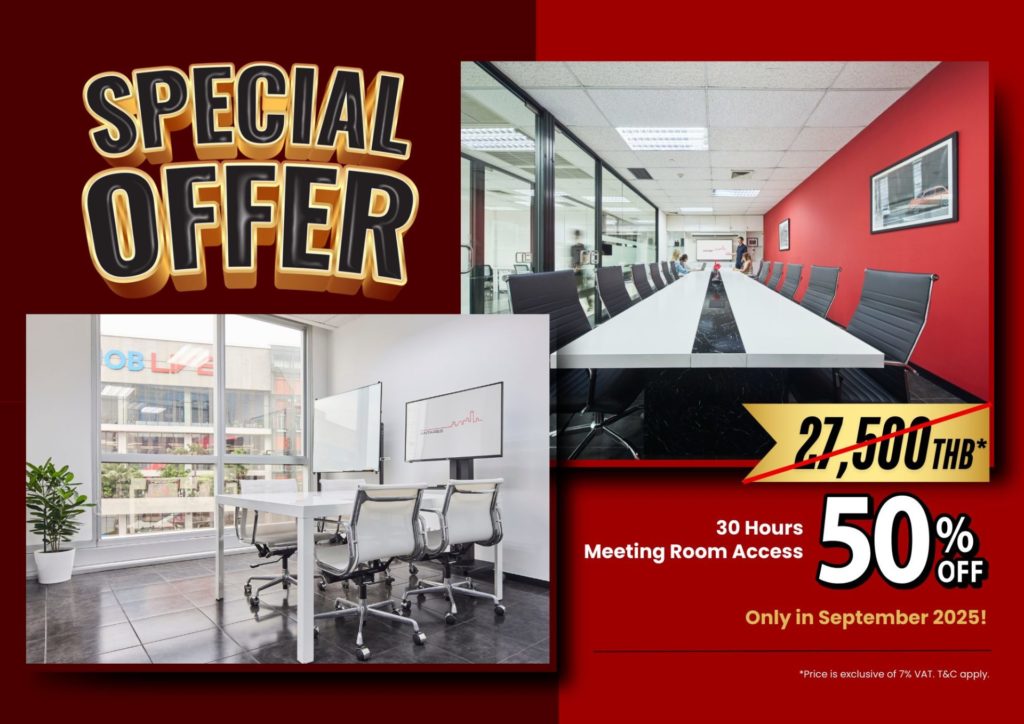 Take your meetings to the next level with our exclusive September promotion! For a limited time only, enjoy 30 hours of fully equipped meeting room access — available in various sizes accommodating up to 18 people — for just 13,750 THB. That’s a massive 50% OFF!