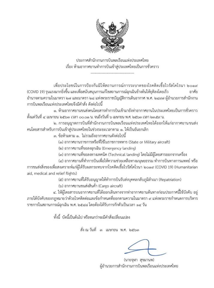 All incoming passenger flights have been suspended for three days, according to the announcement of the Civil Aviation Authority of Thailand.