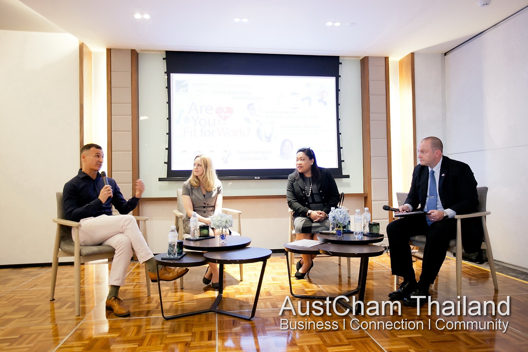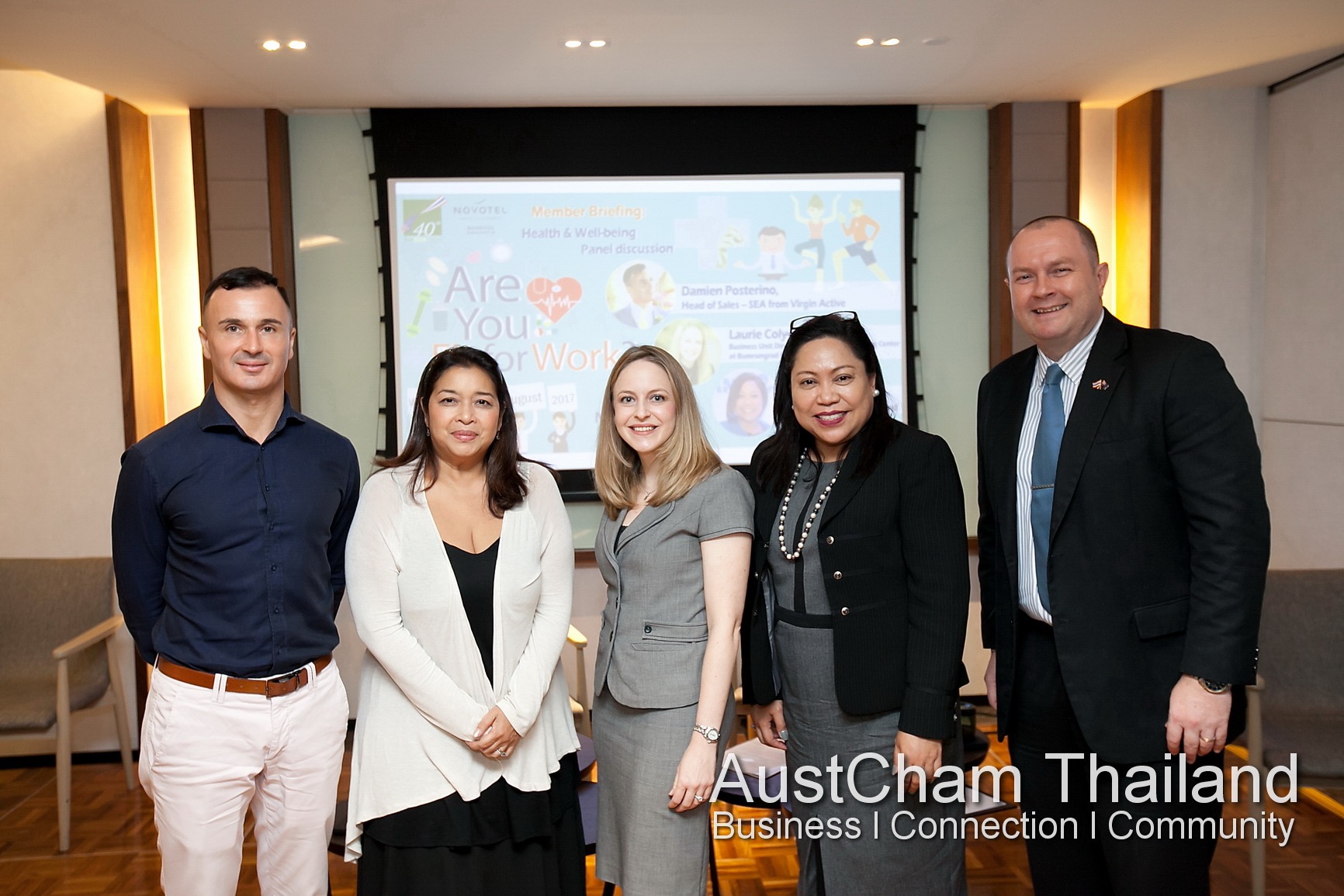 [gallery type="slideshow" columns="1" size="full" ids="https://www.austchamthailand.com/wp-content/uploads/2017/08/img_0121.jpg|"]On Wednesday 2 August, AustCham Members attended a pre-Sundowners panel discussion on Health & Well-being strategies for the workplace with panel members from Virgin Active, Bumrungrad Hospital and ANZ. This briefing focused the growing importance companies are placing on promoting employee well-being to enhance company performance. The briefing was held at Novotel Bangkok Sukhumvit 20.