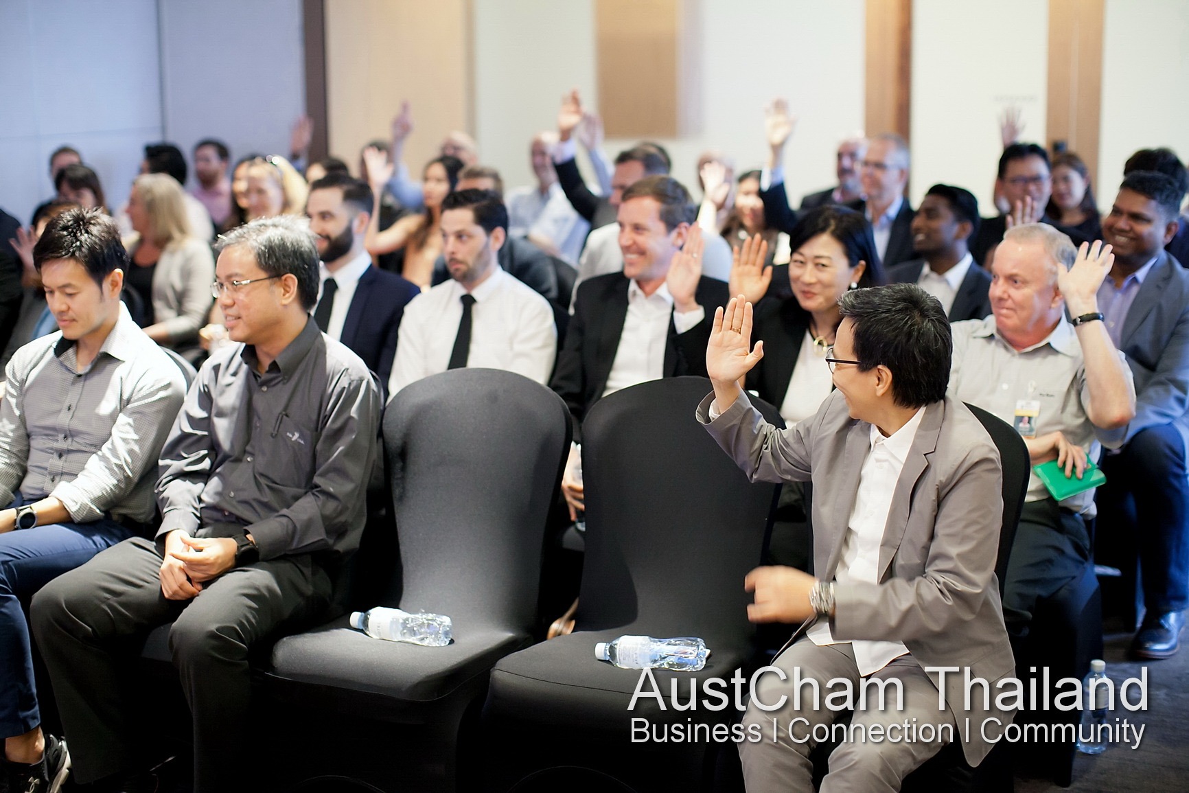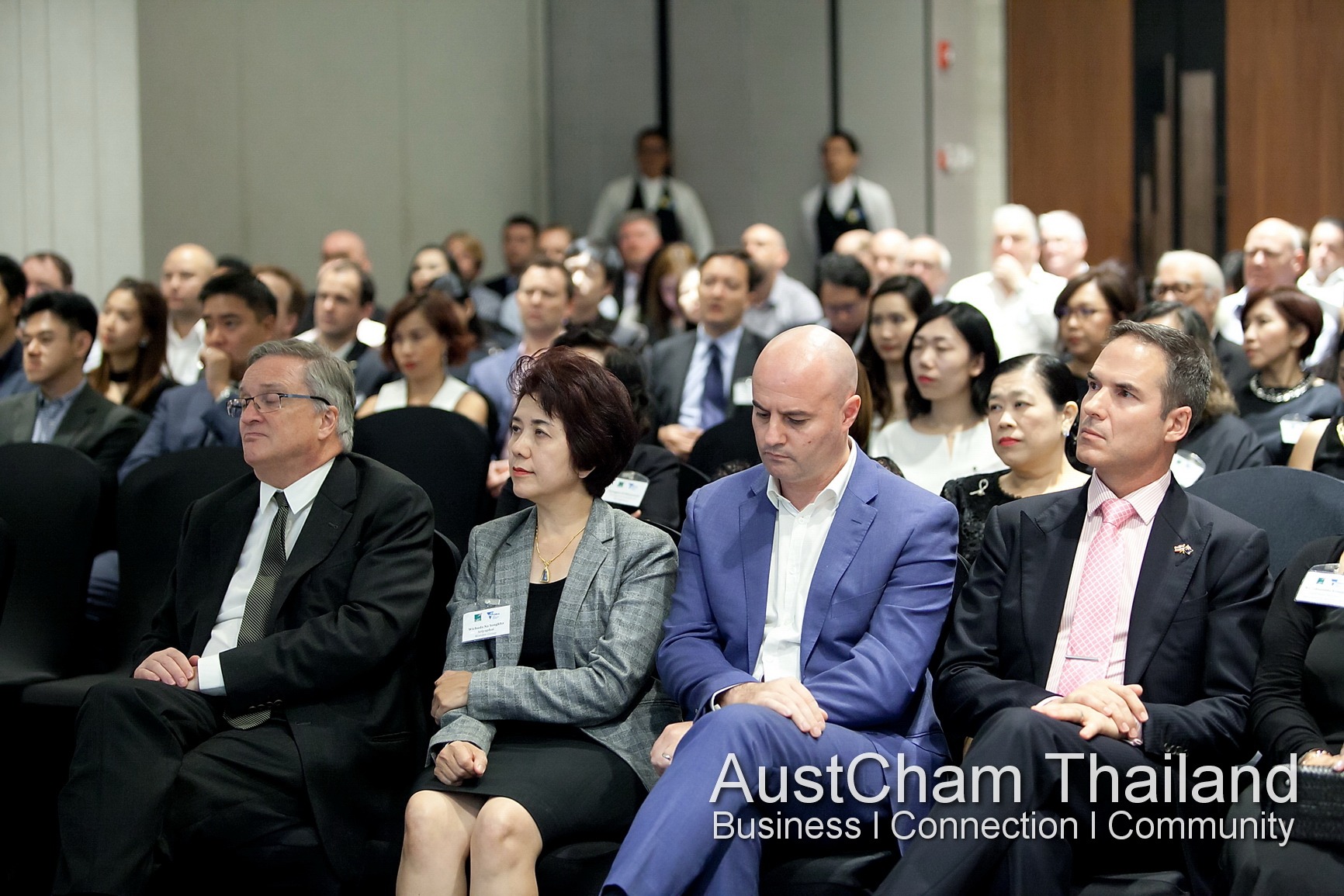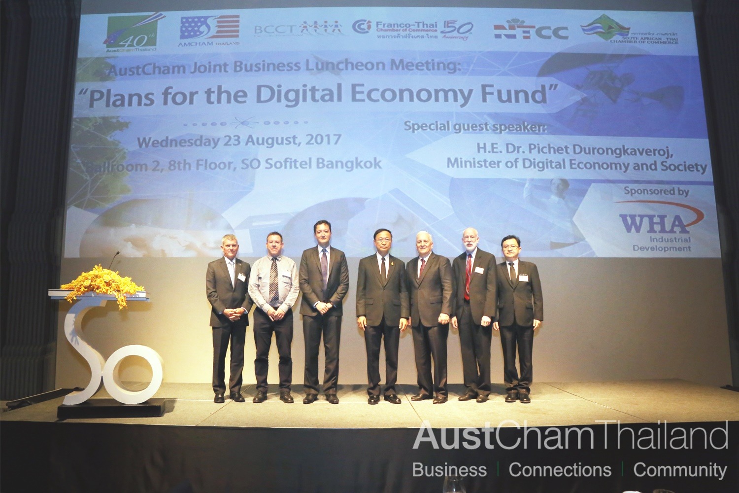 [gallery ids="https://www.austchamthailand.com/wp-content/uploads/2017/08/img_1478.jpg|,https://www.austchamthailand.com/wp-content/uploads/2017/08/img_68182.jpg|,https://www.austchamthailand.com/wp-content/uploads/2017/08/img_68462.jpg|" type="slideshow" orderby="rand"] On Wednesday 23 August 2017, The Australian-Thai Chamber of Commerce (AustCham) in collaboration with the American Chamber of Commerce in Thailand (AMCHAM), British Chamber of Commerce Thailand (BCCT), Franco-Thai Chamber of Commerce (FTCC), Netherlands-Thai Chamber of Commerce (NTCC) and the South African - Thai Chamber of Commerce (SATCC) had organised Joint Business Luncheon Meeting on “Plans for the Digital Economy Fund”. It was our honor to welcome H.E. Dr. Pichet Durongkaveroj, Minister of Digital Economy and Society, as well as the Alumni of the Year 2017, as the special guest speaker. Dr. Pichet had provided us with crucial updates on the Thai government’s “Digital Fund” being set up to support digital entrepreneurs and start-ups, with funding to be distributed beginning in September. Not to mention, the government’s mega project, the “Digital Park” planned for the Eastern Seaboard, and how AustCham members can access and acquire benefit from digital initiatives of Thai government. This event was held at SO Sofitel Bangkok.