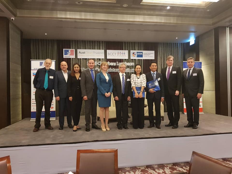 AustCham joined AMCHAM (hosts), BCCT and GTCC to welcome key leaders in this initiative who will provide background on Thailand's Regulatory Guillotine: "Cutting Red Tape, Licenses, and Permits for Economic Growth and its objectives, process, and potential outcomes." In 2017, the Royal Thai Government initiated a deregulation program to cut and amend certain regulations in order to improve the "ease of doing business" ranking for Thailand. Phase 2 of the regulatory guillotine program will start soon and there is an opportunity for American Chamber members in the private sector to participate. Phase 2 will focus on reviewing national license and permit requirements with the objective to eliminate redundant licenses and streamline burdensome and complex procedures in order to promote efficient business activity and economic development. The private sector is now being asked to suggest priority issues to the Regulatory Guillotine Unit on licenses or permits that should be reviewed. Guest speakers were:Dr. Kanate Wangpaichitr DBA, Assistant to the PM Office Minister Dr.Kobsak Pootrakool Thailand Regulatory Guillotine ProjectDr. Duenden Nikomborirak, Ph.D, Research Director – Economic Governance Thailand Development Research Institute