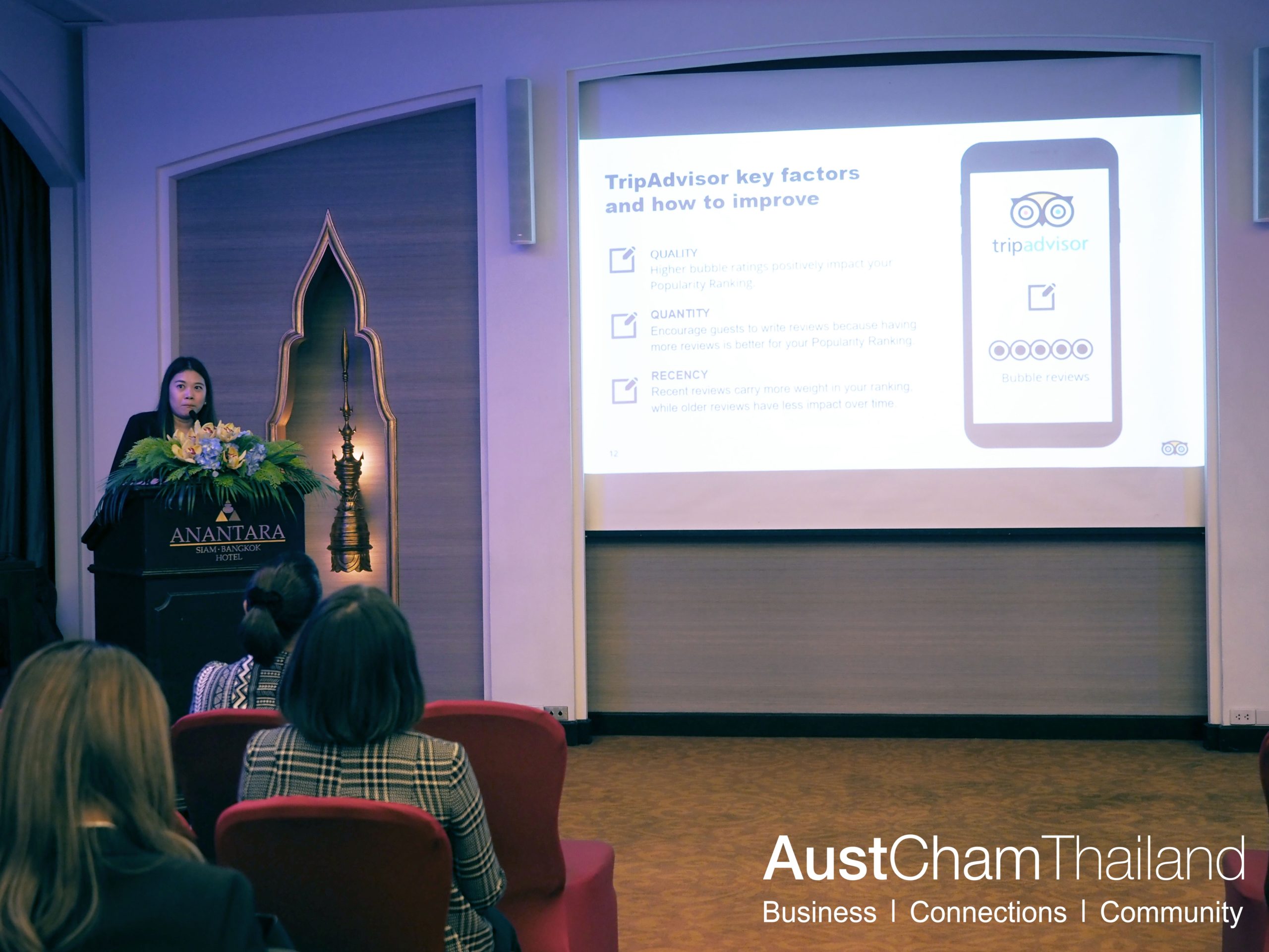 On Wednesday 20 November 2019, AustCham Thailand, in collaboration with our partner chambers, held a Joint Business Cocktail Presentation on "Maximising your Potential with Trip Advisor". We would like to thank the speaker, Ms. Saithip “Tippy” Poolphokphol, Territory Manager for Thailand at Hotel Solutions, TripAdvisor, for taking her time to share information on how hotels, restaurants and tourism venues can maximize their business listing and social media presence through Trip Advisor. Afterward, there was a networking session where attendees had an opportunity to ask questions and talk in-depth with our speaker. Also thank you to AustCham’s hardworking Hospitality & Tourism committee for planning and delivery of this event.