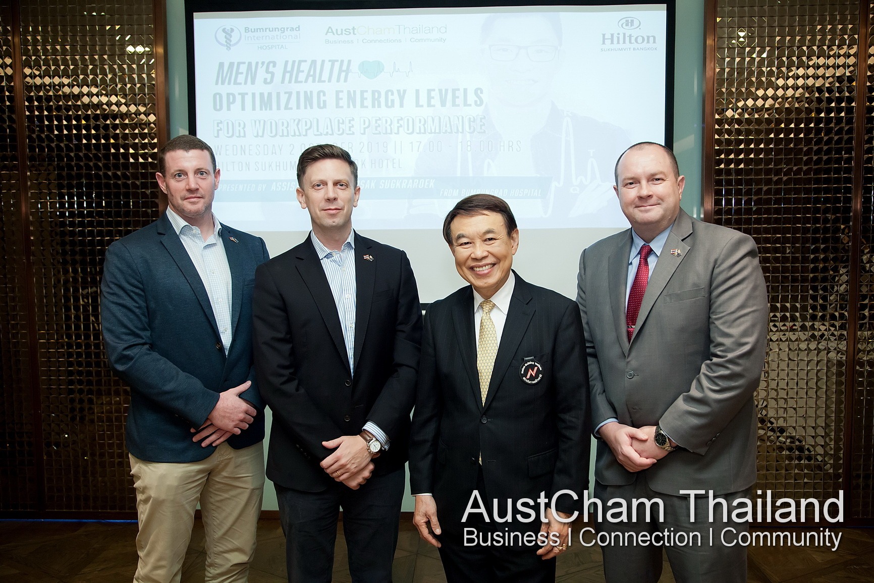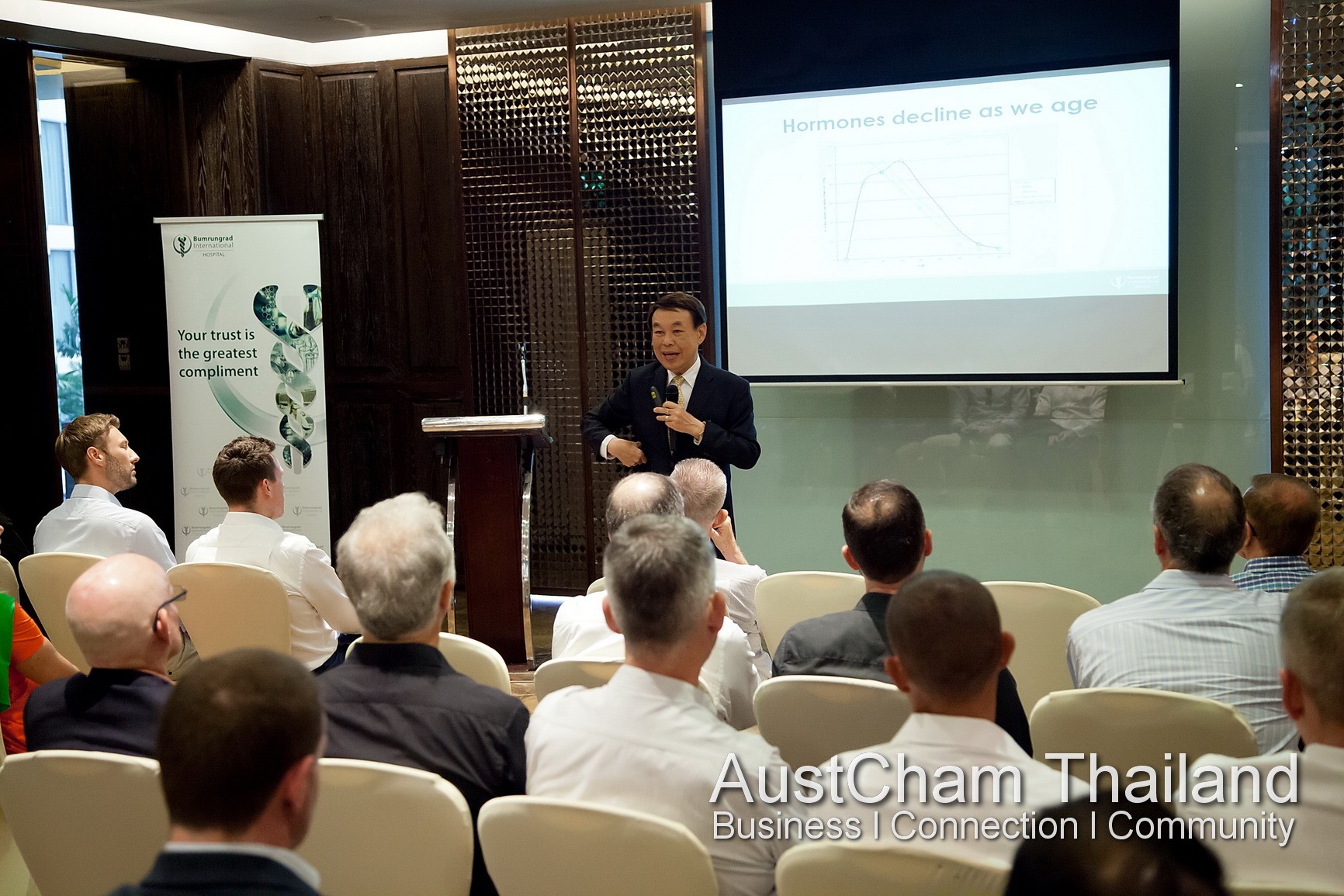 On Wednesday 2nd October 2019, AustCham Thailand held our October Sundowners at Hilton Sukhumvit Bangkok. Attendees enjoyed networking, delectable fare and a wonderful atmosphere at the Hilton Sukhumvit Bangkok. Prior to Sundowners, we organized AustCham Business Briefing: Men’s Health – Optimizing Energy Levels for Workplace Performance. We would like to thank Assist.Prof.Dr. Pansak Sugkraroek from Bumrungrad International Hospital for taking his time to provide his expertise on how to restore men’s optimal hormones to achieve the energy and vitality of their younger selves. All presentations can be found at https://www.austchamthailand.com/events/presentations