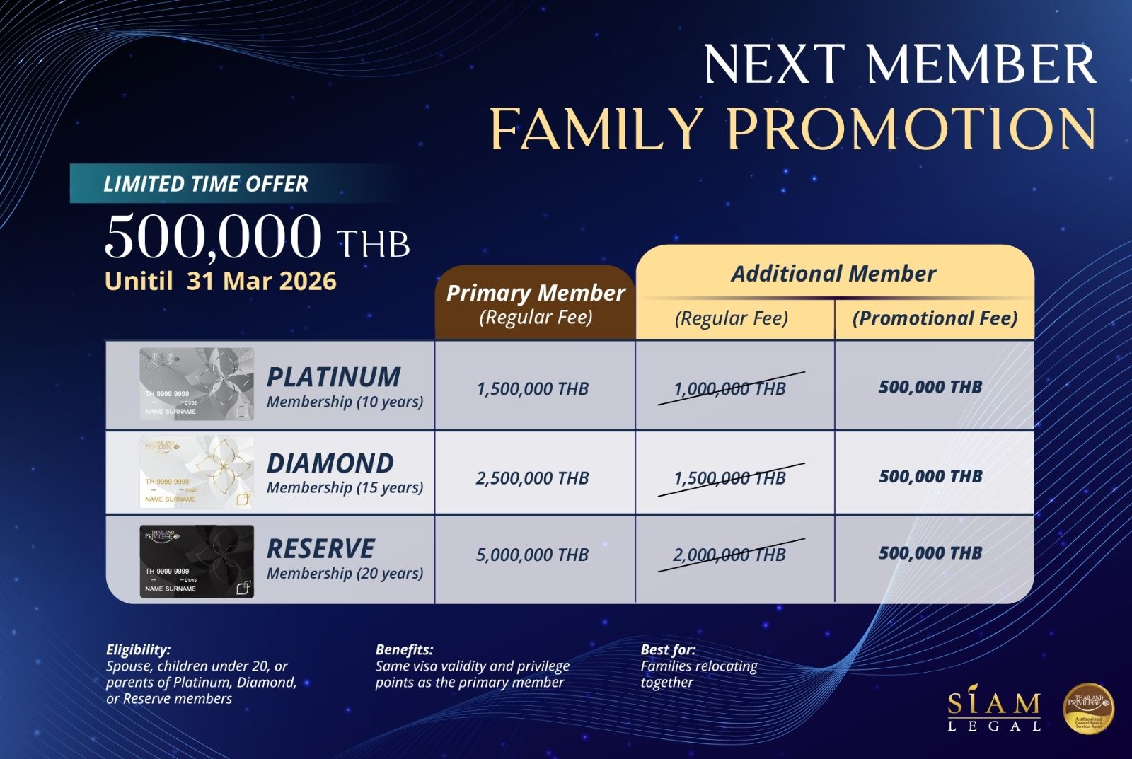 In 2026, Thailand Privilege introduced the Next Member Promotion, a substantial promotional incentive for family memberships, offering savings of up to 1.5 million THB when applications are submitted before March 31, 2026. These incentives have significantly improved accessibility for families seeking long-term residence, education planning, and lifestyle continuity in Thailand.