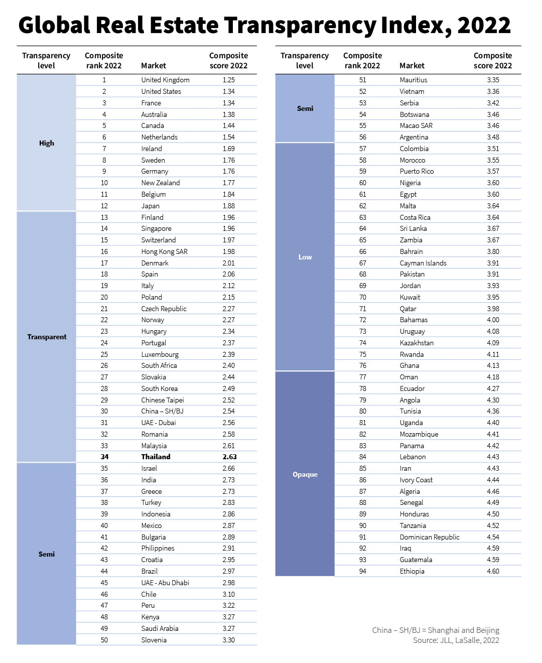 Bangkok / 1 July 2022 – Thailand has held its rankings as the 10th and 3rd most transparent real estate market in Asia Pacific and Southeast Asia respectively, according to JLL and LaSalle Investment Management’s Global Real Estate Transparency Index. The country’s transparency score improved slightly from 2.64 in 2022 to 2.63 in 2022 (1 = high transparency, 5 = opaque). However, its global ranking dropped one position to the 34th place from the previous biennial index as Romania’s global ranking has witnessed a big leap from 35 in 2020 to 32 in 2022.