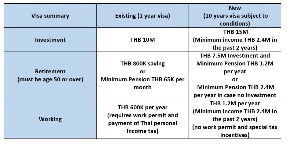 Pros/Cons: There does not appear to be any benefit from the new visa unless the retiree was planning to purchase a property for less than THB 10 million or directly invest in a business for at least THB 7.5 million and already has an annual pension of THB 1.2 million. It is not entirely clear if all of this pension must all be brought into and kept in Thailand – therefore, without these details we are unable to know if it is a more suitable to the existing visa for retirees who don’t wish to directly invest in a business. Proven pensions brought into Thailand are exempt personal income tax.
